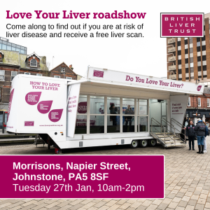 Karen Nightingale of Renfrewshire Alcohol and Drug Partnership said: “We are delighted that the British Liver Trust will be bringing their Love Your Liver roadshow here this month. Ninety per cent (90%) of liver disease is preventable with the main causes being alcohol, obesity and viral hepatitis, but it rarely shows symptoms in the early stages.